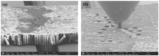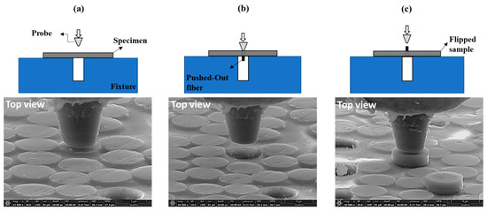 The top and back side of the tested sample were observed with SEM after push-out tests, and micrographs are shown in Figure 6. It can be seen from both the top (Figure 6a) and the back sides (Figure 6b) that the tested fibers were pushed out successfully.