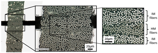 Hybridizing IM and HM fibers at the filament level, in addition to the matrix nano-sized structural reinforcement throughout the composite, has improved microstructural stability governing the fiber-direction compressive strength behavior. The new material solution almost doubles the compressive strength of the HM CFRPs, achieving that of the advanced IM CFRPs currently used in airframes and rotor components, but with a much higher axial modulus. The fiber-dominated axial modulus of the new hybrid composite system is exceeding the modulus of the benchmark IM CFRP by 32% due to the presence of HM fibers with significantly higher modulus compared to IM fibers as listed in the previous paragraph and in Figure 1 [1,2]. It is worth noting that a filament-level fiber hybridization has been essential as the conventional ply-level hybridization does not improve the fiber-direction compressive strength performance. To appreciate the hybridization scales, a HM and IM carbon fiber diameter is approximately 5 μm while a typical CFRP-cured ply thickness is 125–180 μm [1].
