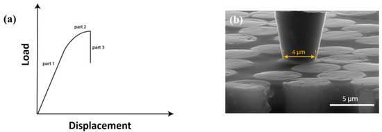 (a) Schematic of the load–displacement response expectation for a single fiber push-out test; (b) flat-end diamond tip.