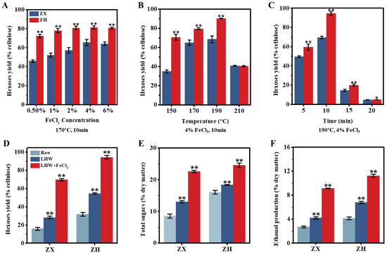 Optimal liquid hot water (LHW) pretreatment co-supplied with FeCl3 for biomass enzymatic saccharification and bioethanol production in two corn (ZX, ZH) cultivars. (A–C) The LHW pretreatments under different conditions by measuring hexose yields released from enzymatic hydrolyses of pretreated residues; (D,E) hexose and total sugar yields under two pretreatments (optimal LHW at 190 °C for 10 min with/without 4% FeCl3) relative to the control (raw material without pretreatment), total sugars calculated from all hexoses and pentoses released from enzymatic hydrolysis; (F) ethanol yield obtained from yeast fermentation by using all hexoses as carbon sources. Data as mean ± SD (n = 3); * or ** a significant difference between two corn cultivars (A–C) or pretreated residue and raw material at p < 0.05 or 0.01 level.