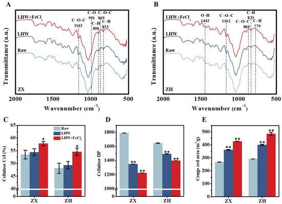 To understand why the 4% FeCl3 supplement with optimal LHW pretreatment could largely extract wall polymers (lignin, hemicellulose) for significantly enhanced biomass enzymatic saccharification, as described above (Figure 1 and Figure S2), we further conducted the Fourier transform infrared (FT-IR) spectroscopic profiling of pretreated lignocelluloses in two corn stalks (Figure 2A,B). As a result, several typical peaks corresponding for the functional groups (C-O-C [26,27], C-H [28,29,30], C-O [31], O-H [31]) associated with wall-polymer interactions were relatively altered in the LHW-pretreated lignocelluloses, particularly for the FeCl3-catalyzed substrates (Table S1), confirming distinct wall-polymer extraction from the optimal LHW pretreatment co-supplied with FeCl3. As a consequence, significantly raised cellulose CrI values were detected in the optimal LHW-pretreated residues with 4% FeCl3 catalysis (Figure 2C), which could explain the significantly higher wall-polymer extraction via the disassociation of hydrogen bonds with cellulose microfibrils in the two corn cultivars [32]. Although the optimal LHW pretreatments significantly reduced the cellulose DP values at the p < 0.01 level (n = 3) compared to their raw materials (without pretreatment), the 4% FeCl3 co-supplement led to the lowest cellulose DP values detected in the two corn cultivars (Figure 2D), which may explain why cellulose accessibility was mostly raised in the LHW-pretreated residues with 4% FeCl3 catalysis (Figure 2E) [33,34]. Using scan electron microscopy, we further observed much rougher surfaces of pretreated lignocellulose residues, particularly from the optimal LHW pretreatments co-supplied with 4% FeCl3 (Figure S3), which was consistent with their remarkably increased cellulose accessibility. As cellulose accessibility is a direct parameter accounting for biomass enzymatic hydrolysis [35], the data obtained in this study demonstrate that 4% FeCl3 catalysis is mostly effective at reducing lignocellulose recalcitrance for significantly enhanced biomass saccharification through optimal LHW pretreatment conducted in the two corn cultivars.