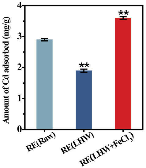 The Cd-adsorption capacity with the enzyme-undigestible residues as biosorbent upon the optimal LHW pretreatment co-supplied with/without 4% FeCl3 in the desirable corn (ZH) cultivar. Data as mean ± SD (n = 3); ** a significant difference between pretreated residues and raw material at p < 0.01 level.