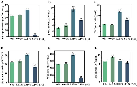 Activity assays in vitro of lignocellulose-degradation enzymes secreted by T. reesei incubation with raw stalk of ZH cultivar co-supplied with different concentrations of FeCl3 in vivo. (A) Filter-paper activity; (B) CBH; (C) EG; (D) BG; (E) xylanase; (F) total protein of supernatant. Data as mean ± SD (n = 3); * or ** a significant difference between FeCl3-supplied samples and control (without FeCl3) at p < 0.05 or 0.01 level.