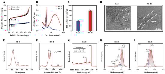 Characterization of the porous carbons generated by 1:2 (w/w) FeCl3-activated thermal–chemical conversion of the lignocellulose residues (RE) from T. reesei incubation with raw ZH stalk co-supplied with 0.05% FeCl3. (A–C) For the two carbon generated from RE-I (Raw + 0.05% FeCl3) and RE-II (Raw + 0.05% FeCl3) + 1:2 FeCl3: (A) TEM observation; (B) nitrogen adsorption/desorption isotherm profiling; (C) pore-size-distribution profiling; (D) BET surface-area assay. (E–I) For the carbon sample generated from RE-II: (E) X-ray assay; (F) Raman-spectra profiling; (G) XPS-spectra profiling; (H,I) high-resolution XPS spectrum at C1s region and high-resolution XPS spectrum at O1s region (I). ** a significant difference between two lignocellulose residues at p < 0.05 or 0.01 level.