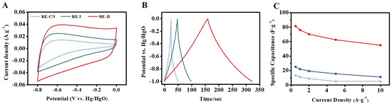 Electrochemical properties of the porous carbon generated by 1:2 (w/w) FeCl3-activated thermal–chemical conversion of the lignocellulose residues (RE) from T. reesei incubation with raw ZH stalk co-supplied with 0.05% FeCl3. (A–C) For the three carbon samples generated from RE-I (Raw + 0.05% FeCl3), RE-II (Raw + 0.05% FeCl3) + 1:2 FeCl3 and RE-CN (raw, incubated with T. reesei without FeCl3): (A) Cyclic-voltammetry curves at 100 mV s−1; (B) galvanostatic charge/discharge curves at 0.5 A/g; (C) specific capacitance calculated by galvanostatic charge–discharge at different current densities.