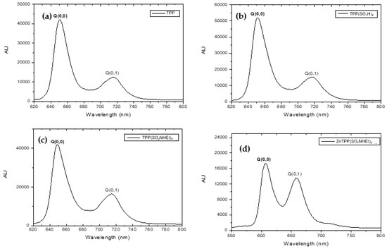 | ZnTPP(SO2NHEt)4 | 427 (4.9 × 105) | 561 (2.1 × 104) | 600 (9.2 × 103) | ---- | --- | 607 | 659 | 0.04 |