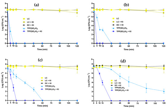 - Santos, A.R.; Batista, A.F.P.; Gomes, A.T.P.C.; Neves, M.G.P.M.S.; Faustino, M.A.F.; Almeida, A.; Hioka, N.; Mikcha, J.M.G. The Remarkable Effect of Potassium Iodide in Eosin and Rose Bengal Photodynamic Action against Salmonella Typhimurium and Staphylococcus aureus. Antibiotics 2019, 8, 211. [Google Scholar] [CrossRef]