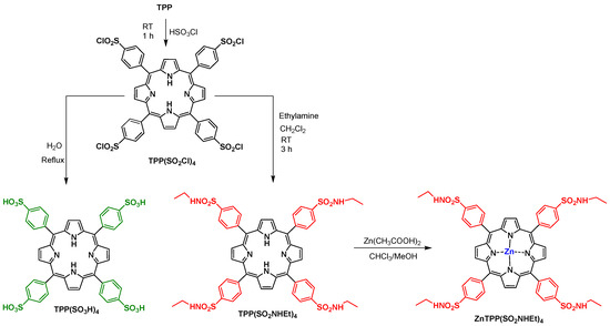- Gonsalves, A.M.A.R.; Johnstone, R.A.W.; Pereira, M.M.; deSantAna, A.M.P.; Serra, A.C.; Sobral, A.; Stocks, P.A. New procedures for the synthesis and analysis of 5,10,15,20-tetrakis(sulphophenyl)porphyrins and derivatives through chlorosulphonation. Heterocycles 1996, 43, 829–838. [Google Scholar]