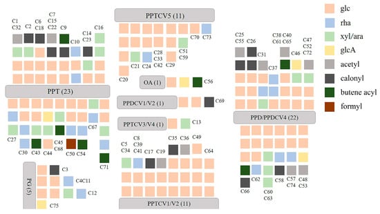The 75 potential new ginsenosides’ type of aglycone and glycone. PPDCV and PPTCV represent PPD type and PPT type saponins with side chain changes, respectively.