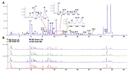 All of the 63 standard references were detected in four kinds of P. ginseng extracts. The TIC (total ion chromatogram) chart of the standard references and four kinds of samples was shown in Figure 4A,B. After a comprehensive analysis of the retention times, molecular weights, and ion fragments, a total of 261 ginsenosides including 54 potential new compounds from L5, 292 ginsenosides including 65 potential new compounds from L15, 273 ginsenosides including 59 potential new compounds from Y5, and 266 ginsenosides including 56 potential new compounds from N5 were identified, respectively.
