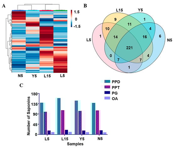 The proportions of different types of ginsenosides in the four groups of P. ginseng are shown in Figure 5C. The PPD-type and PPT-type ginsenosides account for the largest proportion of ginsenosides in our research, similarly to relevant studies on P. ginseng [48]. It showed that protopanaxadiol and protopanaxatriol saponins were the main constituents in P. ginseng, and the proportions of different ginsenoside types are similar in the four groups. Except for the protopanaxadiol saponins, not only the quantity of total saponins but also each other types saponins of P. ginsengs in L15 were higher than that in other groups. Comparing L15 with L5, it was concluded that the growth time was an important cause of the chemical difference of P. ginseng under the same environmental conditions. As for the difference between L5, Y5, and N5, it can also be concluded that the ecological environments also play a key role in the growth process of ginseng.
