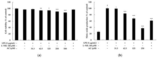 The effect of acenocoumarol on viability and nitric oxide (NO) production in RAW 264.7 cells. The cells were treated with acenocoumarol (AC, 31.3, 62.5, 125, 250, and 500 μM) and stimulated with LPS (1 μg/mL) for 24 h. L-NIL (40 μM) was used as the positive control. AC was evaluated using the MTT assay. Cell viability was expressed as a percentage relative to the untreated cells (a). The amount of NO in the medium was measured using the Griess reagent (b). The results are presented as the mean ± SD from three repeated experiments. # p < 0.001 vs. the unstimulated control group. * p < 0.05, ** p < 0.01, *** p < 0.001 vs. LPS alone.