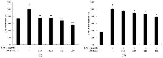 The results of the experiments were expressed as the mean and standard deviation (mean ± SD) through three repeated experiments. Statistical significance was determined based on p-values using the Student’s t-test, # p < 0.001 vs. the unstimulated control group. * p < 0.05, ** p < 0.01, *** p < 0.001 vs. LPS alone.