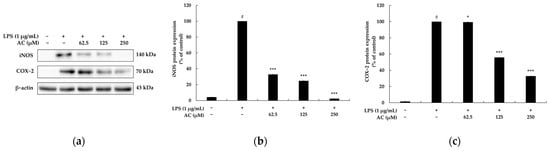 The effect of acenocoumarol on iNOS and COX-2 protein expression in the LPS-induced RAW 264.7 cells. The cells were treated with acenocoumarol (62.5, 125, and 250 μM) and LPS (1 μg/mL) stimulation for 22 h. (a) Western blotting results, (b) iNOS protein expression, (c) COX-2 protein expression. The results are presented as the mean ± SD from three repeated measurements using ImageJ. # p < 0.001 vs. the unstimulated control group. * p < 0.05, *** p < 0.001 vs. LPS alone.