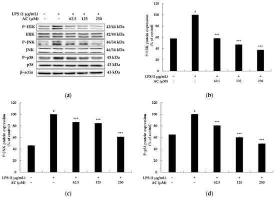 The effect of acenocoumarol on MAPK protein expression in the LPS-induced RAW 264.7 cells. The cells were treated with acenocoumarol (62.5, 125, and 250 μM) and LPS (1 μg/mL) stimulation for 20 min. (a) Western blotting results, (b) P-ERK protein expression, (c) P-JNK protein expression, (d) P-p38 protein expression. The results are presented as the mean ± SD from three repeated measurements using Image J. # p < 0.001 vs. the unstimulated control group. *** p < 0.001 vs. LPS alone.