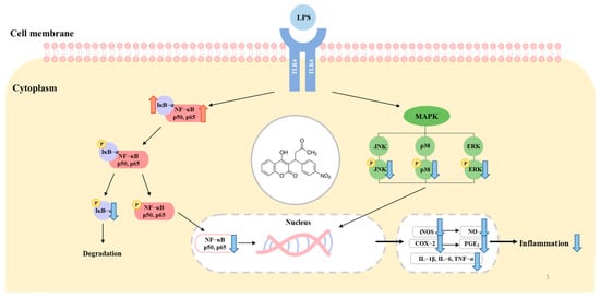 Mitogen-activated protein kinase (MAPK) is another important signaling pathway activated in LPS-induced macrophages through the TLR4. During the inflammation process, members of the MAPK family, consisting of three main subfamily members (i.e., ERK, p38, and JNK), are phosphorylated to adjust the expression of iNOS, COX-2, and other pro-inflammatory cytokines. Thus, it has been suggested that inhibitors targeting the p38 and JNK MAPK pathways have anti-inflammatory activity [40,41]. To investigate whether the MAPK signaling pathway is also affected by acenocoumarol, the phosphorylation of ERK, p38, and JNK was analyzed. The results indicate that the levels of phosphorylated ERK, p38, and JNK in the RAW 264.7 macrophages are significantly increased in the presence of LPS, while treatment with acenocoumarol results in a concentration-dependent decrease in the phosphorylation of the MAPK family proteins. These results suggest that the effects of acenocoumarol on the production of inflammatory mediators and pro-inflammatory cytokines are likely mediated through the blocking of the ERK, p38, and JNK signaling pathways in the RAW 264.7 cells.