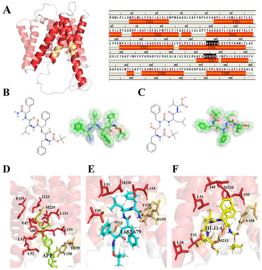 The PSH cavity is surrounded by transmembrane helices TM3, TM6, TM7 and TM9, and the motifs (AVYDA on TM6 and MGMGD on TM7) are important for substrate catalyzing. Figure 1A shows the helices in red and the catalytic motifs in a golden color. L679, a peptide-like inhibitor, is located at PSH (PDB code:4Y6K) [29] (Figure 1B,E). APP and the inhibitor, III-31-C (Figure 1C), were docked to PSH with Autodock vina [30] (Figure 1D,F). The docking pose with the lowest energy between the ligands and the PSH was chosen for further study. Figure 1D shows the active residues around APP to PSH. F47, I48, L51, L52, F139, L151, L155, Y158, D159, M220 and I223 were key residues for the PSH binding to APP. Figure 1E shows that L51, T55, L155, Y158, D159, M213 and M220 were key residues for PSH to bind to the inhibitor L679. Figure 1F shows the active residues (I48, L51, T55, l58, L155, Y158, M213 and M220) of PSH around III-31-C. Figure S1A,B displays the interactions between L697 and III-31-C and PSH. Figure S2 shows the interactions between APP and PSH.