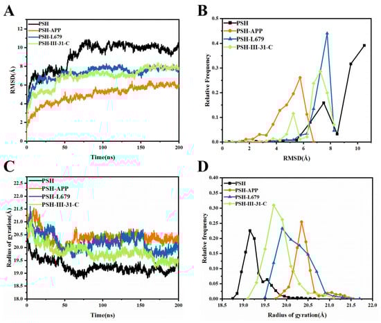 Analysis of structural stability. (A) The temporal evolution of the RMSDs from their initial structure of the four systems. (B) Relative frequencies of RMSDs for the four systems. (C) The radius of gyration over 200 ns MD for the four systems. (D) Relative frequencies of radius gyration.