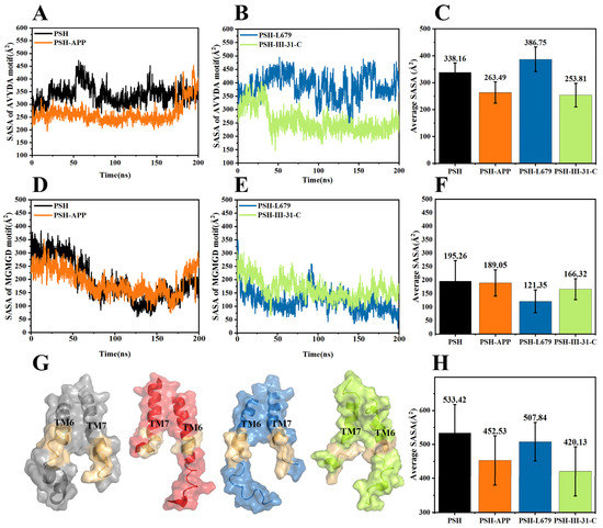 SASA values of the AVYDA catalytic motif of (A) PSH and PSH-APP, (B) PSH-L679 and PSH-III-31-C during the 200 ns MD. (C) Average SASA values of the AVYDA catalytic motif during the 200 ns for the four systems. SASA values of the MGMGD catalytic motif of (D) PSH and PSH-APP, (E) PSH-L679 and PSH-III-31-C during the 200 ns MD. (F) The average SASA values of MGMGD catalytic motif during the 200 ns for the four systems. (G) The surface of TM6 and TM7 of the four systems. PSH, PSH-APP, PSH-L679 and PSH-III-31-C are shown from left to right, respectively. The two catalytic motifs are shown in golden color. (H) The average sum of the two motifs’ SASA values indicated that the catalytic motifs of PSH-III-31-C had the smallest solvent-accessible surface area.
