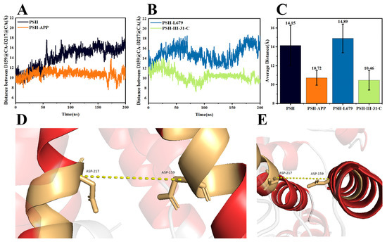 Further, we also explored the distance between the hydrophilic residues Asp159 and Asp217. The distance between the CA atoms of Asp159 on TM6 and Asp217 on TM7 during 200 ns MD is shown in Figure 4 (Figure 4A shows PSH and PSH-APP and Figure 4B shows PSH-L679 and PSH-III-31-C, respectively). The average distance between the active residues, Asp159 and Asp217, of the four systems is shown in Figure 4C. Figure 4D,E illustrate the distance between the catalytic residues Asp159 and Asp 160. Based on the observations, the distance in PSH-III-31-C was the closest. A closer distance between the two active residues indicates that they passed through a narrower channel, making it difficult for the substrate to enter. Our results were consistent with the experimental results that III-31-C is a better inhibitor for PSH than L679 [2]. Altogether, the III-31-C binding brought TM6 and TM7 closer together, resulting in the PSH active site contract and thereby aiding the binding.
