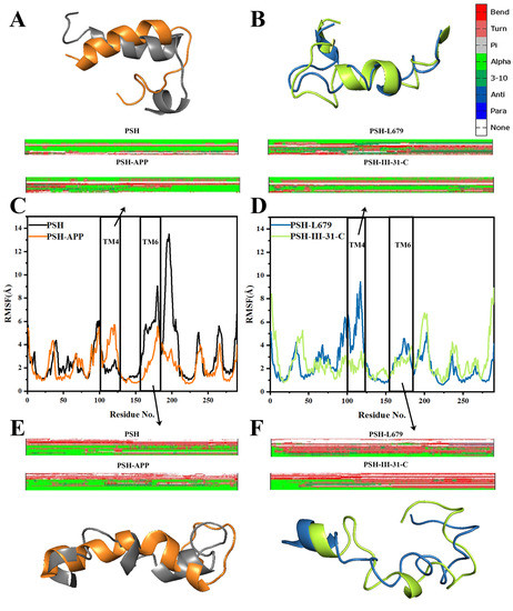DSSP and structures comparison of TM4, (A) PSH and PSH-APP and (B) PSH-L679 and PSH-III-31-C. The RMSFs of CA atoms in the four systems. (C) PSH compared with PSH-APP. (D) PSH-L679 compared with PSH-III-31C. The TM4 and TM6 regions are shown as rectangles. DSSP and structures comparison of TM6, (E) PSH and PSH-APP and (F) PSH-L679 and PSH-III-31-C.