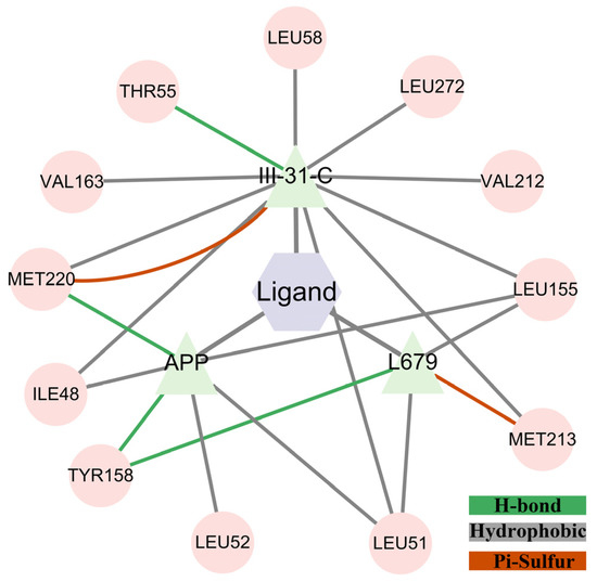 Figure 6 shows the interaction network analysis between ligands and PSH. The nodes represent residues, and the edges represent interactions. The gray color indicates the hydrophobic forces, green represents the hydrogen bonds and red represents pi–sulfur. Figure 6 shows that more residues interacted with III-31-C than L679. In addition, the III-31-C inhibitor and Leu272, located at TM9, had hydrophobic interactions that were useful for III-31-C binding to PSH.