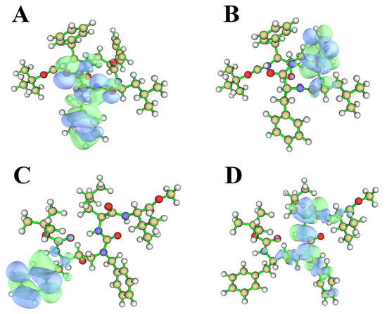 (A) Molecular structure and LUMO orbitals of L679. (B) Molecular structure and HOMO orbitals of L679. (C) Molecular structure and LUMO orbitals of III-31-C. (D) Molecular structure and HOMO orbitals of III-31-C.