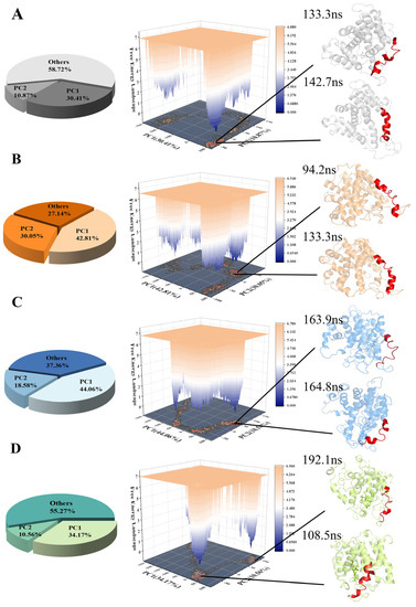 A PCA analysis of the CA atoms, performed for the four systems, is shown in Figure 8A–D). PC1 and PC2 accounted for more than 40%, reflecting the reliability of the results. The red region shows the conformational changes in TM6. The stable conformations are consistent with the previous analysis.