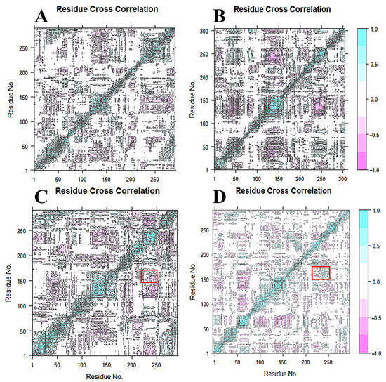 The dynamic cross-correlation map for the 200 ns MD simulation trajectories of the four systems: (A) PSH, (B) PSH-APP, (C) PSH-L679 and (D) PSH-III-31-C. The positive regions are shown in cyan and the negative regions are colored in pink, representing correlated and anti-correlated motions between residue CA atoms. Red rectangles show the action between TM6 and TM7.