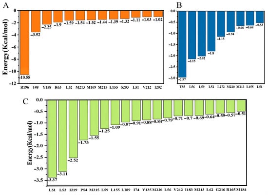 Figure 10A–C show the binding energy contribution of residues in three PSH–ligand systems. From Figure 10A, R196, I48, R63, L52, M213, M169, L165, S203, L51, V212 and I202 were key residues for APP binding to PSH. T55, L56, L59, L52, L272, M220, M213, L155 and L51 were key residues for L679 binding to PSH (Figure 10B). Comparatively, L56, L52, I219, P54, M215, L59, L155, L189, I74, V135, M220, L56, V212, I183, M213, L62, G216, R165 and M184 were key residues for III-31-C binding to PSH (Figure 10C). Altogether, we found that more residues were involved in III-31-C binding to PSH, which decreased the free energy between III-31-C and PSH.