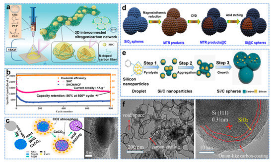 (a) Schematic illustration of formation procedure of the SHCM/NCF paper, (b) cycling property at 1 A g−1 [30]. (c) Schematic illustration of the reaction from SiO2 sphere to the final Si@C composite and TEM image of Si@C composite [31]. (d) Schematic illustration of the formation process of the composite Si anode [33]. (e) Schematic illustration of the formation of onion−like Si/C spheres, (f) TEM and HRTEM image of sample [34].
