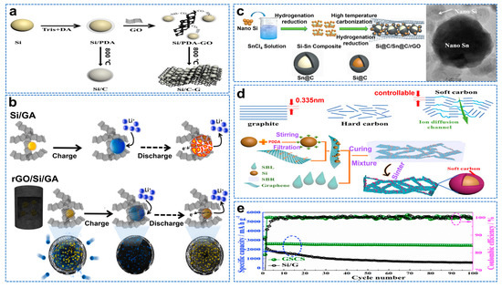 (a) Preparation of Si/C−G materials [38]. (b) Si/GA and rGO/Si/GA composite anodes before and after lithiation/de−lithiation processes [40]. (c) Schematic illustration of the synthesis of Si@C/Sn@C/rGO and TEM images of sample [41]. (d) Schematic of preparation of GSCS. (e) Cycling performance of GSCS and Si/G at 0.2 A g−1 [42].