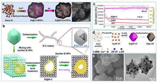 Porous carbon frames often expose Si to the surface, resulting in unstable SEI [43]. Due to the excellent impermeability of graphene, it may hinder the diffusion of lithium ions. Therefore, as a carbon layer, a metal–organic skeleton (MOF) can effectively encapsulate Si and form a 3D frame structure, which has been proven to be the ideal carbon frame for lithium batteries [44,45]. Luo et al. embedded Si nanoparticles into the porous framework of nitrogen−doped carbon/cobalt/CNTs (Si@NC/Co/CNTs) and synthesized Si matrix composites, as shown in Figure 4a [46]. Si@NC/Co/CNTs have excellent cycling performance (758 mAh g−1 after 800 cycles at 1 A g−1). The composites prepared with Zn−MOFs have larger specific surface areas than those prepared with Co−MOFs. Moreover, ZIF−8 containing N and Zn ions can be transformed into ZnO/N−doped carbon composites or nitrogen−doped carbon composites at different temperatures [47]. Therefore, ZIF−8 has excellent potential in Si/C composites due to its controllable configuration and high surface area. Wei et al. also used the molten−salt magnesium thermal reduction method to prepare spongy carbon−based anchored saccular Si using ZIF−8 as raw material, as shown in Figure 4b [48]. The saccular Si nanoparticles and the buffer space in the sponge matrix can coordinate to adapt to the volume change of Si and maintain the integrity of the electrode. At 0.2 A g−1, the initial Coulombic efficiency is 84%. After 500 cycles, the capacity of the composites is 1448 mAh g−1 at 2 A g−1, as shown in Figure 4c. Gao et al. prepared Si@C−ZIF by in situ encapsulation of Si nanoparticles to form a metal–organic skeleton (MOF)−derived carbon shell, as shown in Figure 4d, whose TEM and HRTEM images are shown in Figure 4e [49]. It exhibits excellent electrochemical properties, with a capacity of 3714 mAh g−1 at 0.2 A g−1 and a reversible capacity of 820 mAh g−1 at 5 A g−1, even after 1000 cycles.