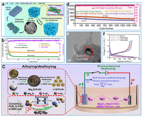 (a) Schematic of the evolution of 3D−NP SiGe structure via chemical dealloying [51]. (b) The galvanostatic cycle performance of SOS and SOFS electrodes at 500 mA g−1 [55]. (c) Schematic illustration of the self−driven alloying–electrochemical dealloying process for the formation of n−Si/FeSi. (d) Cycle performance at 2 A g−1 [56]. (e) Magnified TEM image of red circles. (f) Galvanostatic lithiation and de−lithiation voltage profile of Si/Cu3Si, T−Si/Cu3Si@C and C−Si/Cu3Si@C conducted at 0.2 A g−1 [57].