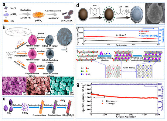 (a) Schematic illustration of the synthesis of pSiOx@pC [59]. (b) Schematic illustration of the synthetic procedure for SiOx/C HS−TA, SiOx/C HS−GA, SiOx/C HS−GL and SEM images [60]. (c) Schematic of preparation of the SiOx@TiO2/C fibers [62]. (d) Schematic illustration of the preparation of C−SiOx/C and SEM images [63]. (e) Long−term cycling performances of SiOx/NCS and SiOx/C at 1 A g−1 [66]. (f) Schematic illustration of the fabrication process of the SiOx/N/S−rGO composite. (g) Cycling performance at 0.5 A g−1 [68].