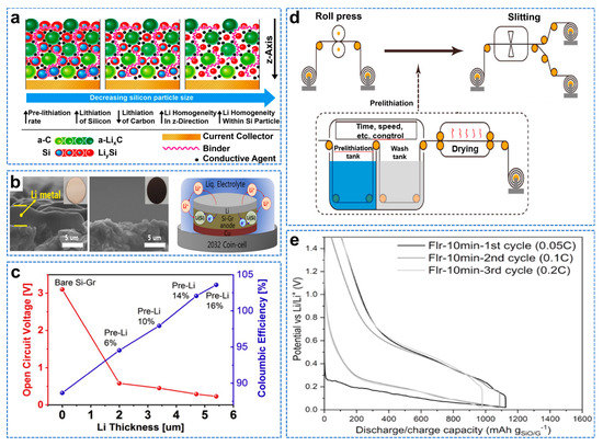 (a) Schematic illustration of the impact of Si particle size on the pre−lithiation behavior of Si/C composite anode materials in LIB cells, dependent on the Si particle size and electrode thickness (z−direction) [77]. (b) SEM images of the Li−evaporated Si−Gr anode, pre−lithiation Si−Gr anode and schematic representation of the pre−lithiation reaction process, (c) The open circuit voltages and the Coulombic efficiencies of the pre−lithiation Si−Gr anodes at different evaporated Li+ thicknesses [79]. (d) Schematic diagram of SiO pre−lithiation, (e) Lithiation/de−lithiation curves of the cell made with Flr−10min half−cell during formation process [81].