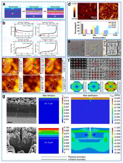 (a) Sketch of the three−step lithiation process [119]. (b) Comparison of IMC−measured total heat flow (black) and the sum of polarization and entropic heat flow (red) [121]. (c) In situ AFM images of Micro−Si and Nano−Si electrode cycled at a scanning rate of 0.6 mV s−1 between 1.5 and 0.0 V in the 1 M LiPF6/EC/DMC, (d) Modulus images of SEI−M, SEI−N and Young’s modulus distributions of SEI−M, SEI−N, M−SEI and N−SEI [123]. (e) Surface changes after 30 cycles, (f) Scanning electron microscope (SEM) images of square micropillars fabricated on a p−type Si(100) wafer obtained at various lithiation stages and finite element results, (g) Cross−sectional focused ion beam (FIB)−scanning electron microscope (SEM) images (left column) and corresponding finite element method (FEM) results (middle and right columns) of a Si(100) electrode obtained after 3 and 50 lithiation/de−lithiation cycles [124].
