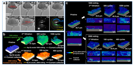 (a) In situ TEM observation of the lithiation process of a porous Si particle [125]. (b) X−ray nanotomography reconstruction with volume rendering shows the morphological evolution of the np−Si anode, (c) Quantitative material density 3D maps and pseudo cross sections from X−ray nanotomography showing electrode cycled in constant capacity mode [127].