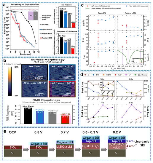 (a) Comparison of SSRM 3−D resistivity vs. depth profiles, SEI thickness and integrated SEI resistance obtained from resistivity vs. depth profiles for SEI with varied resting protocols, (b) AFM images at 1 × 1 µm showing surface morphology of SEI with 50 cycles of SEI formation with varied resting protocols and RMS roughness from the same surfaces, calculated from larger 5 × 5 µm AFM images [139]. (c) Best−fit results of XRR datasets of high−potential (red markers) and low−potential (blue markers) sequence experiments, (d) Voltage−dependent XPS fit−derived peak areas corresponding to Si 2p, O 1s, F 1s, and Li 1s spectral ranges, (e) Schematic illustration of the proposed potential−dependent SEI growth mechanism on native oxide−terminated Si anodes [140].