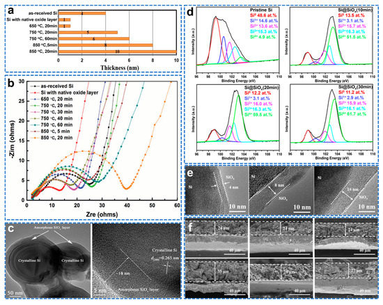 (a) Comparison of thickness of the thermally grown oxide layers under different oxidation conditions, (b) Electrochemical impedance spectroscopy (EIS) curves after de−lithiation in the second cycle [143]. (c) TEM image and HRTEM image for Si@SiOx (20 min) sample, (d) High resolution XPS spectra of Si 2p for pristine Si, Si@SiOx (10 min), Si@SiOx (20 min), and Si@SiOx (30 min) samples [144]. (e) TEM images of Si−9 h, Si−11 h, and Si−13 h, (f) Cross−sectionals before and after 200 cycles of GSC−9 h, GSC−11 h, and GSC−13 h electrodes [145].