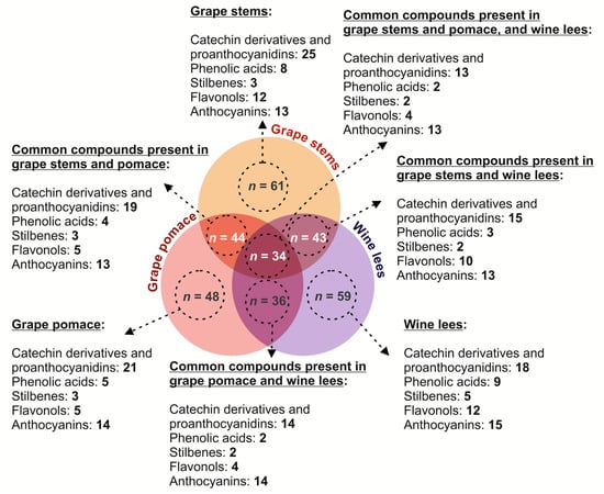 The analysis of the distribution of the different classes of phenolic compounds in grape stems and pomace, as well as wine lees (catechin derivatives and proanthocyanidins, phenolic acids, stilbenes, flavonols, and anthocyanins) suggest complementarity between all three materials, concerning their value as sources of bioactive phenolics. These differences could be responsible, to some extent, for the synergies that are explored in the present work, since they can help obtain new formulations, which would enhance their applicability as sources of health-promoting compounds. In this regard (Figure 1), the most abundant number of individual phenolics was found in grape stems and wine lees (n = 61 and n = 59, respectively), while only 48 phenolic compounds were identified in grape pomace. Catechin derivatives and proanthocyanidins, as well as anthocyanidins, were found to be the most ubiquitous compounds (Figure 1).