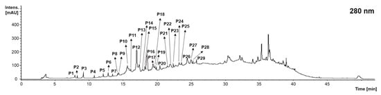 Chromatogram recorded at 280 nm representative of the catechin derivatives and proanthocyanidins (P) recorded in grape stems, grape pomace, and wine lees. Identification of the peaks annotated according to Table 1.
