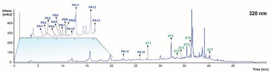 Regardless of the isomers, 11 individual phenolic acids were identified, namely galloyl-hexoside (peaks PA1 and PA7), gallic acid (peaks PA2 and PA3), gentisic acid (PA4), protocatechuic acid-O-hexoside (peaks PA5, PA6, and PA8), caftaric acid (PA9), caftaric acid-glucuronide (PA10), caftaric acid derivative (PA11), p-coumaric acid pentoside (PA12), p-coumaric acid (PA13), ferulic acid pentoside (PA14), and gallic acid derivative (PA15) (Table 2).