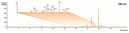 Chromatogram recorded at 360 nm representative of the flavonols (Fl) recorded in grape stems, grape pomace, and wine lees. Identification of the peaks annotated according to Table 4.