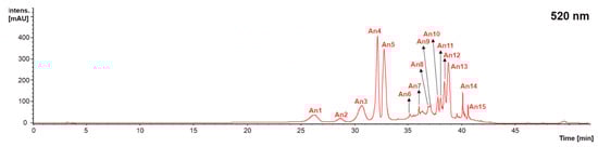 Chromatogram recorded at 520 nm representative of the anthocyanins (An) recorded in grape stems, grape pomace, and wine lees. Identification of the peaks annotated according to Table 5.