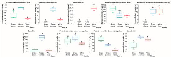 Box plots with quartiles (upper values 75%, median 50%, and lower values 25%) of individual catechin derivatives and proanthocyanidins (mg/kg dw) of (poly)phenolic extracts of grape stems (green box), grape pomace (blue box), and wine lees (red box). Boxes with a different letter (a–c) within each plot indicate statistically significant differences (p < 0.05) according to the one-way analysis of variance (ANOVA) and Tukey’s multiple range test. <LOQ, lower than the limit of quantification.