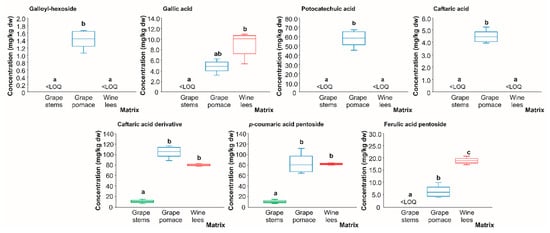 Box plots with quartiles (upper values 75%, median 50%, and lower values 25%) of individual phenolic acids (mg/kg dw) of (poly)phenolic extracts of grape stems (green box), grape pomace (blue box), and wine lees (red box). Boxes with a different letter (a–c) within each plot indicate statistically significant differences (p < 0.05) according to the one-way analysis of variance (ANOVA) and Tukey’s multiple range test. <LOQ, lower than the limit of quantification.