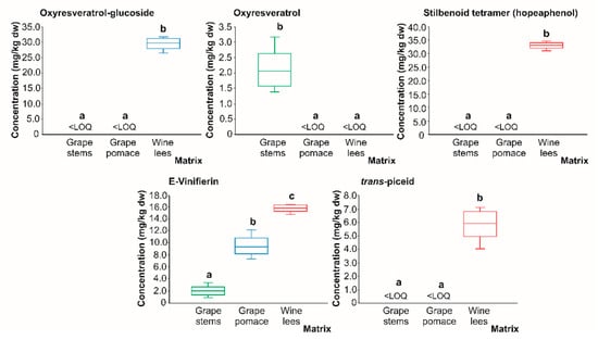 Box plots with quartiles (upper values 75%, median 50%, and lower values 25%) of individual stilbenes (mg/kg dw) of (poly)phenolic extracts of grape stems (green box), grape pomace (blue box), and wine lees (red box). Boxes with a different letter (a–c) within each plot indicate statistically significant differences (p < 0.05) according to the one-way analysis of variance (ANOVA) and Tukey’s multiple range test. <LOQ, lower than the limit of quantification.