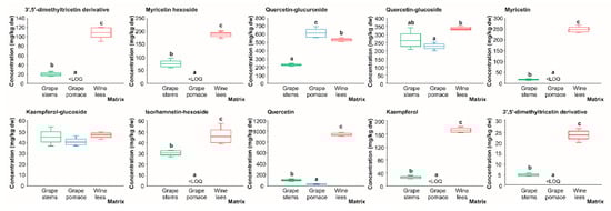 Box plots with quartiles (upper values 75%, median 50%, and lower values 25%) of individual flavonols (mg/kg dw) of (poly)phenolic extracts of grape stems (green box), grape pomace (blue box), and wine lees (red box). Boxes with a different letter (a–c) within each plot indicate statistically significant differences (p < 0.05) according to the analysis of variance (ANOVA) and Tukey’s multiple range test. <LOQ, lower than the limit of quantification.