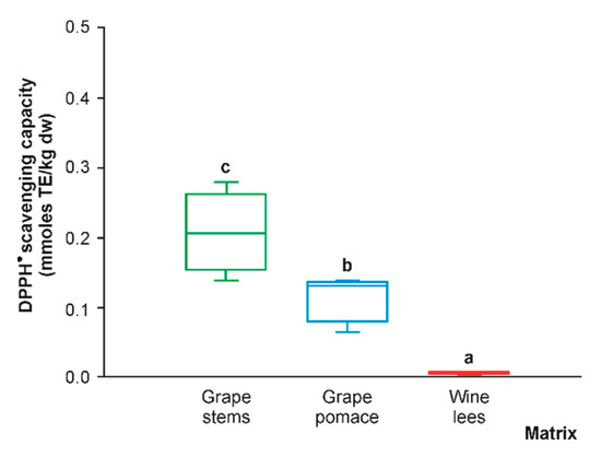 Because of the broad information included in the article on the (poly)phenolic composition of the grape stems, grape pomace, and wine lees, the radical scavenging capacity of these materials was assessed by a single method. Because of the accepted requirement to measure antioxidant activity by eight or more methods, we selected the DPPH test, according to Baliyan et al. (2022), since this method is the quickest, easiest, and most affordable approach for the measurement of antioxidant power []. When evaluating the DPPH• scavenging capacity of the hydro-methanolic extracts of phenolic compounds of the grape stems, grape pomace, and wine lees, the significantly highest values corresponded to the grape stems (183.55 mmol TE/kg dw, on average), which surpassed the anti-radical power of the grape pomace and wine lees by 47.3% and 98.6%, respectively (Figure 11). Recently, the phenolic extracts obtained from grape stems have been gaining more attention as antioxidants [,,].